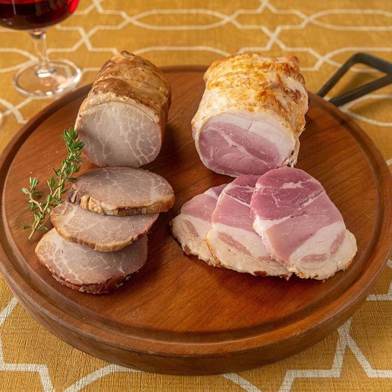 | 原材料 | 【焼豚】 豚もも肉(鹿児島県産黒豚)、しょうゆ、みりん、ワイン、りんご果汁、香辛料、調味料(アミノ酸等)、カラメル色素、甘味料(ステビア)、(一部に小麦・大豆・豚肉・りんごを含む) 【ローストポーク】 豚もも肉(鹿児島県産黒豚)、食塩、砂糖、香辛料、/リン酸塩(Na)、酸化防止剤(V.C)、調味料(アミノ酸)、発色剤(硝酸K、亜硝酸Na)、保存料(ソルビン酸K)、香辛料抽出物、香料 |