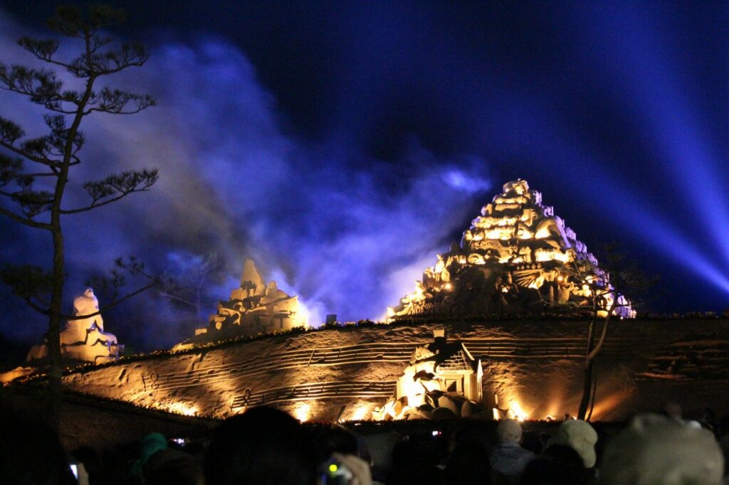 そして期間中には夜のライトアップと打ち上げ花火が行われ、昼とは違う幻想的な表情を見せる砂像も魅力のひとつです。